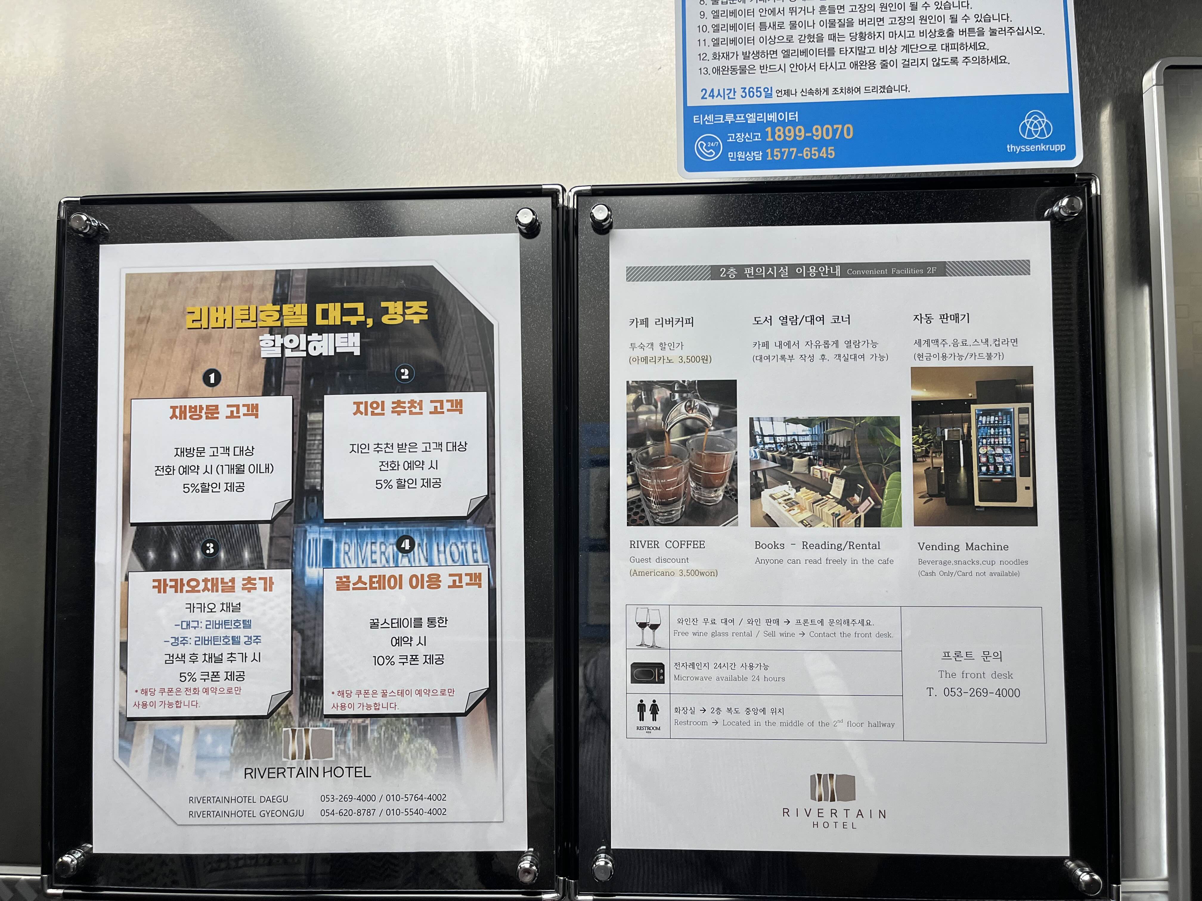 리버틴호텔은 번화가 중심지에 있어서 위치는 완전 대만족! 근처에 술집, 카페, 편집샵이 다 있어서 웨이팅이 길 때는 호텔침대에서 잠시 쉬다 오기도 했어요! 저는 네이버 검색 최저가를 찾아 여기어때에서 예약을 했는데! 재방문 고객 대상 전화예약시 5%할인, 그리고 지인추천 5%할인 등 할인혜택이 다양하게 있어요! 협력 업체가 꿀스테이 인것 같은데, 꿀스테이로 예약하면 10% 쿠폰이 지급되네요~ 리버틴호텔은 경주에도 있다고 하는데 경주점, 대구점 둘다 조식이 맛있기로 유명하더라구요 ^^