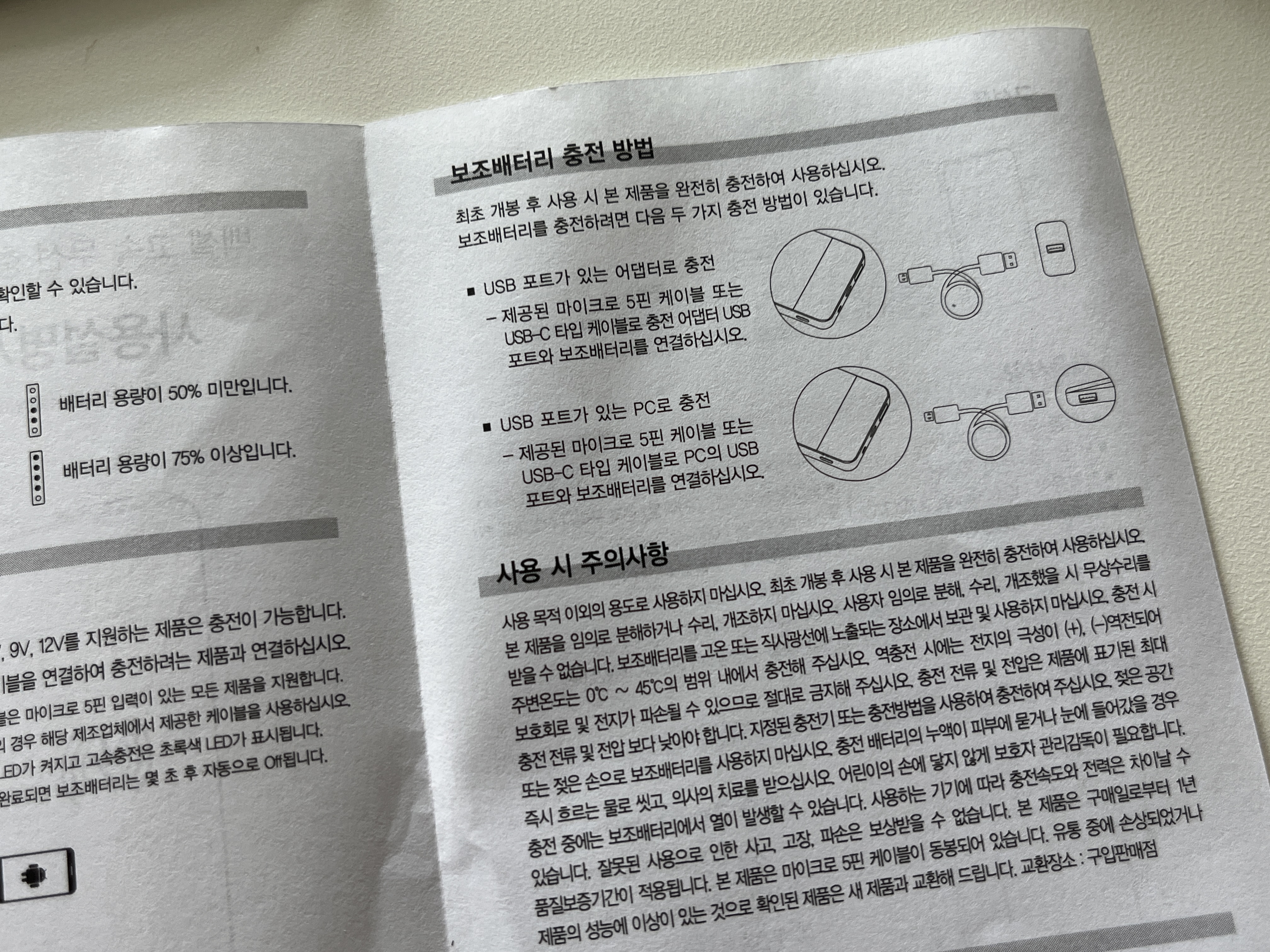 최초 개봉 후에는 배터리가 완충인 상태가 아니라 완전히 충전 후 사용해야한다. 혹시나 하는 마음에 개봉해서 바로 크로스백에 넣었는데 느낌이 싸해서 보니 배터리가 거의 없었다 ^^ 보조 배터리 자체를 충전하려면 동봉된 케이블(USB-C)를 연결해서 사용하거나 혹은 PC의 usb포트에 연결하면 충전이 된다. 완충하기까지는 꽤나 시간이 걸렸던 걸로 기억!