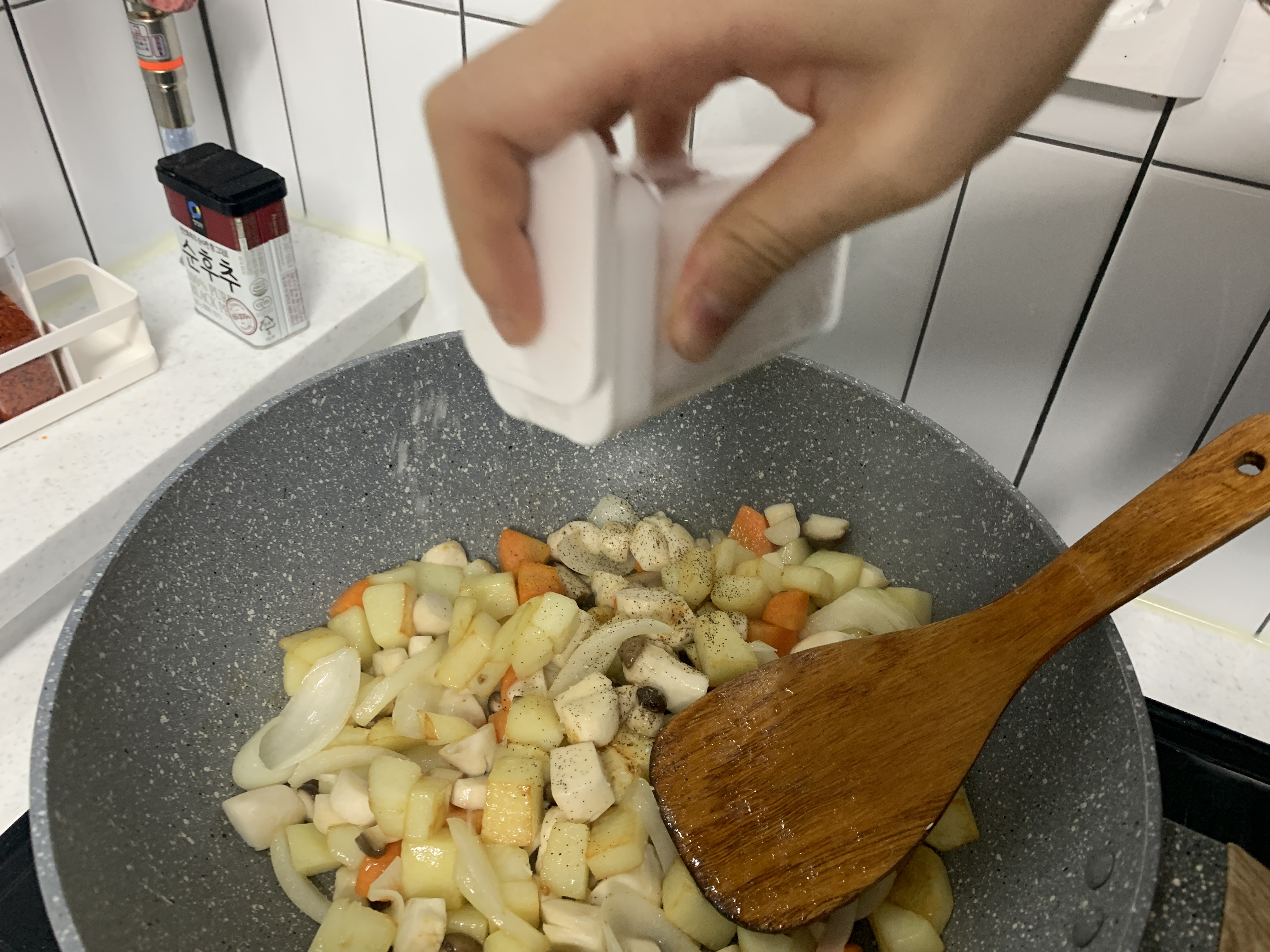 그리고 약간의 후추와 소금으로 간을 합니다! 뭐 사실 굳이 안해도 상관은 없는데 (카레가루의 맛이 너무 강하기 때문에) 전 톡톡톡 뿌려줬습니다. 열심히 볶아줍니다.