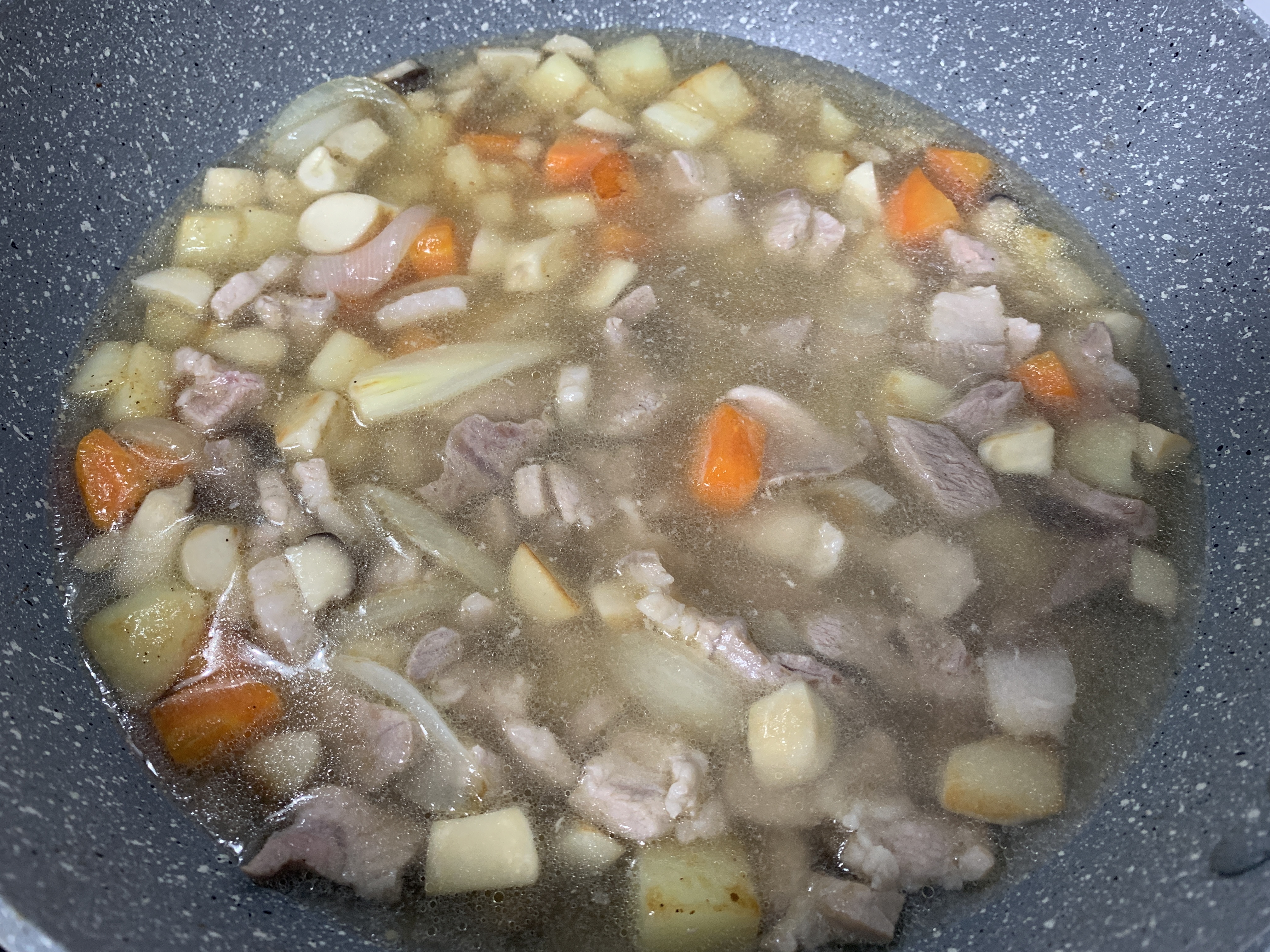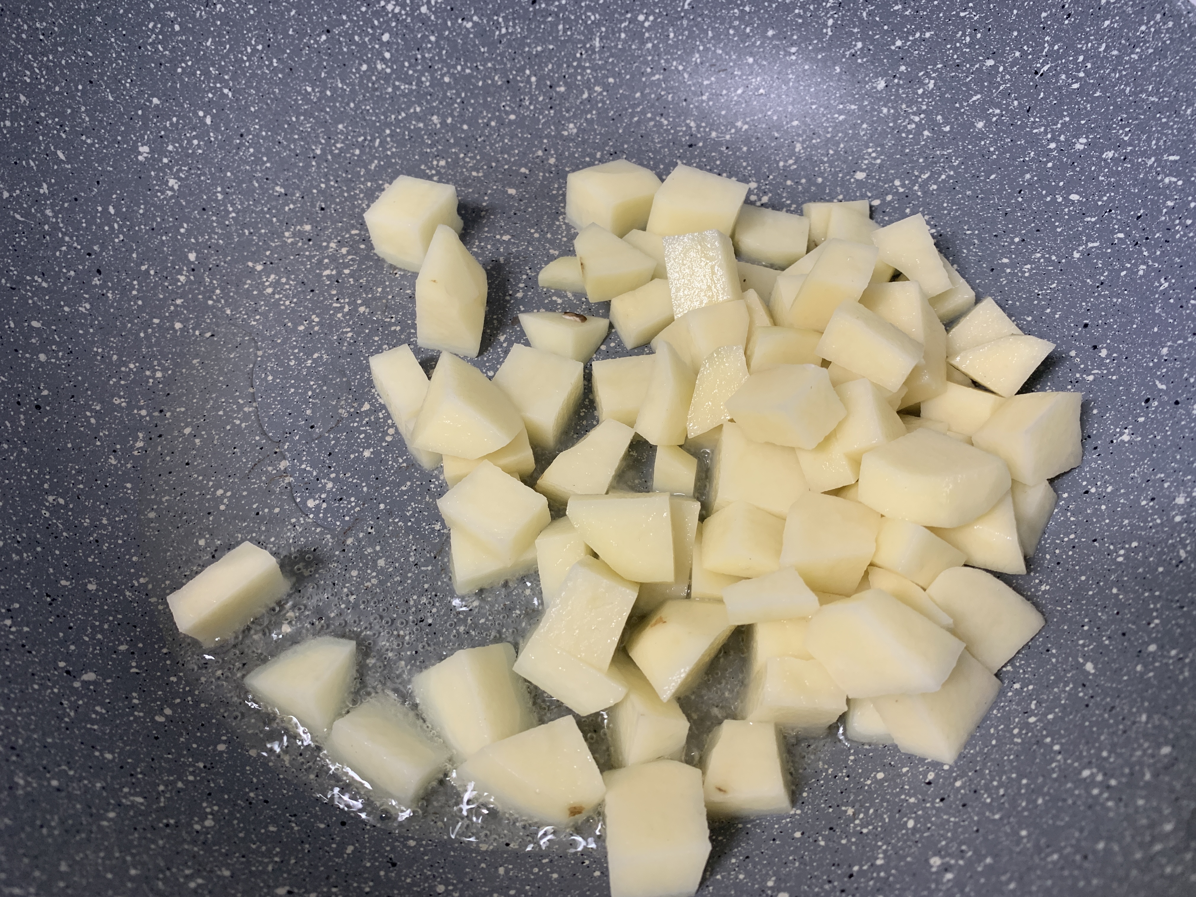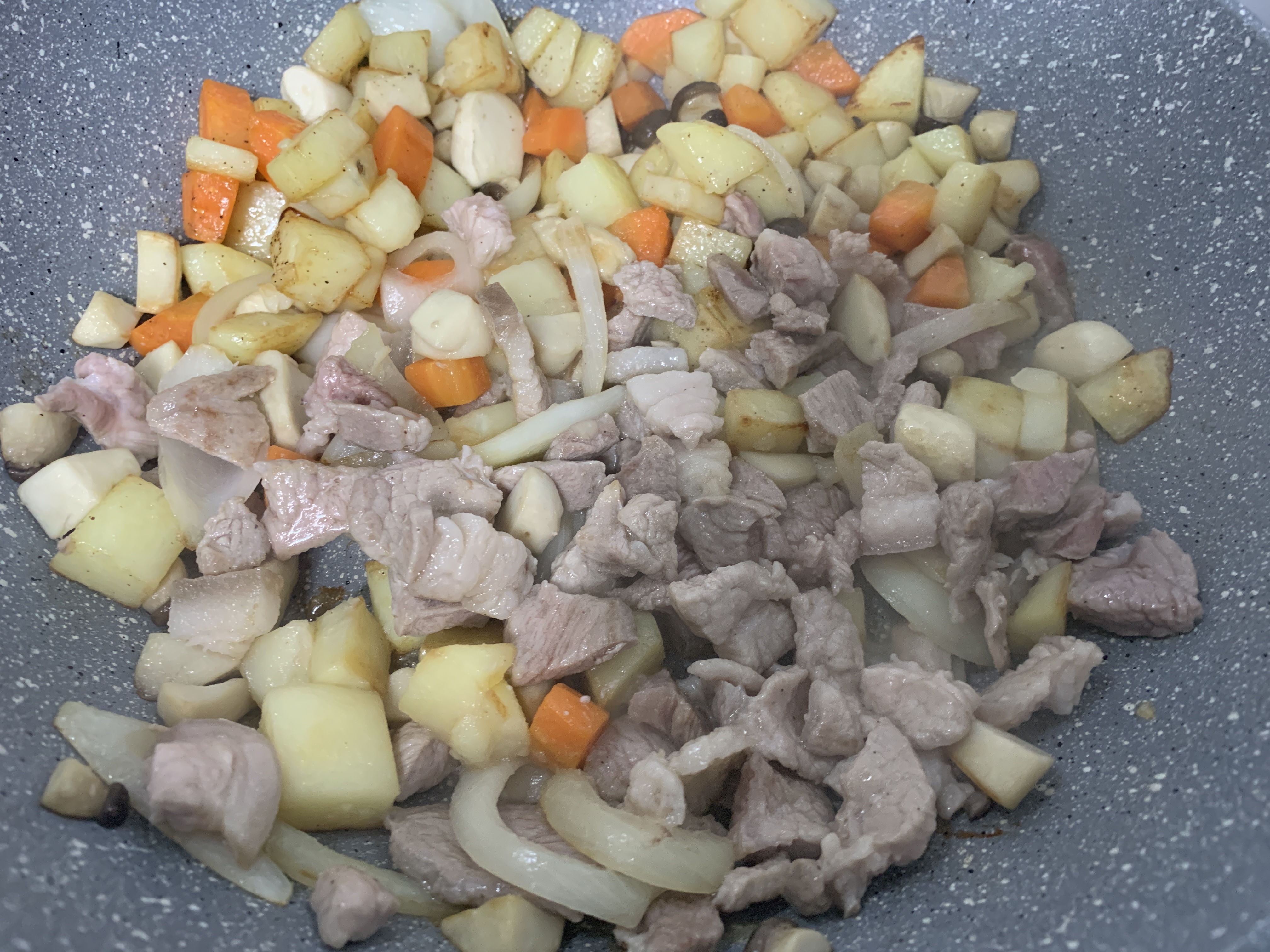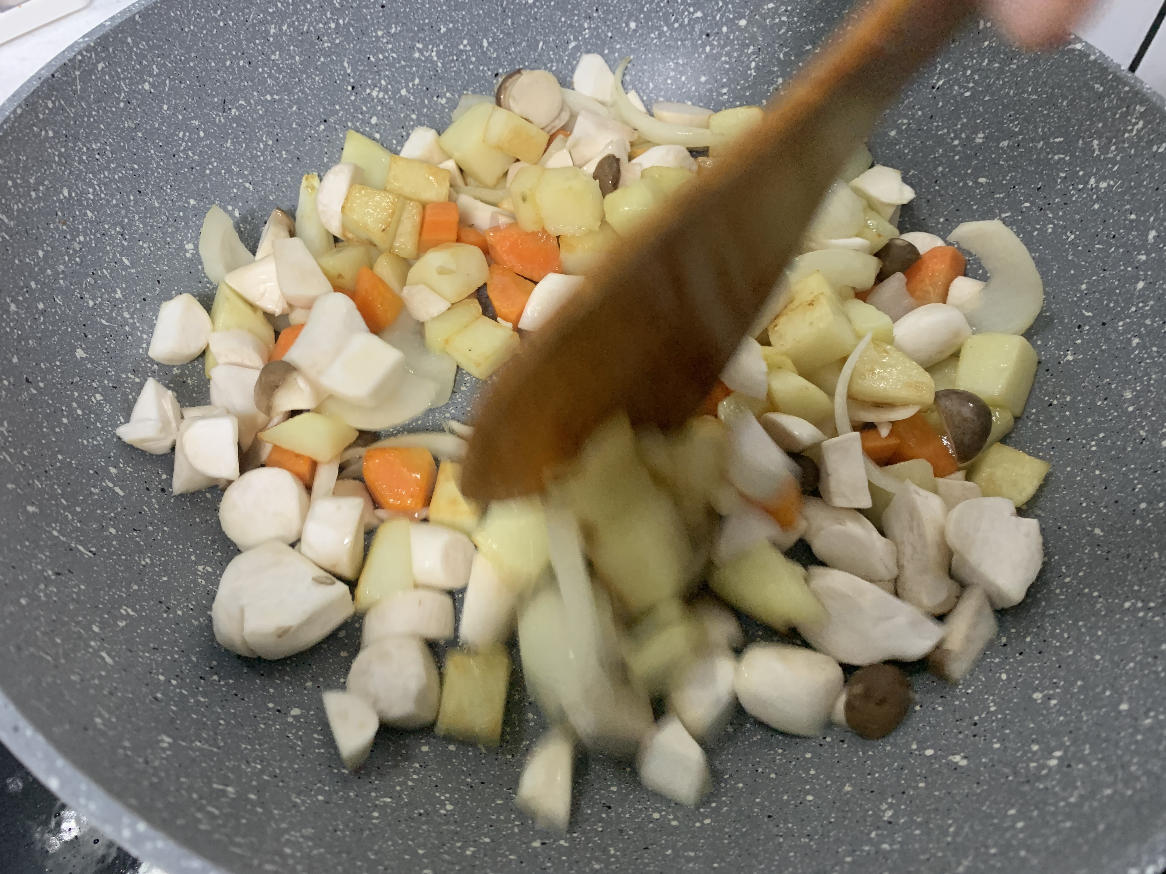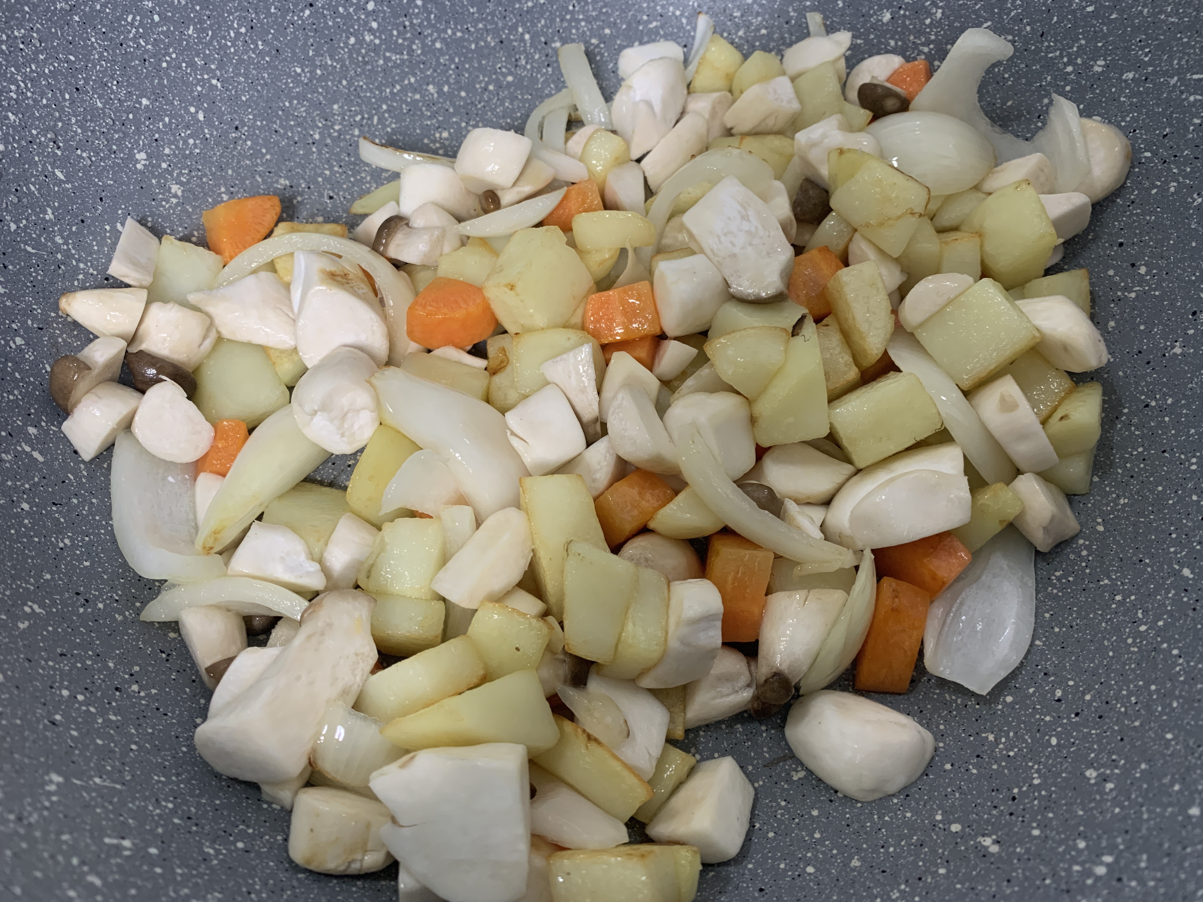 2. 예열된 후라이팬에 기름을 넣고 감자>당근>양파>버섯 순으로 볶기