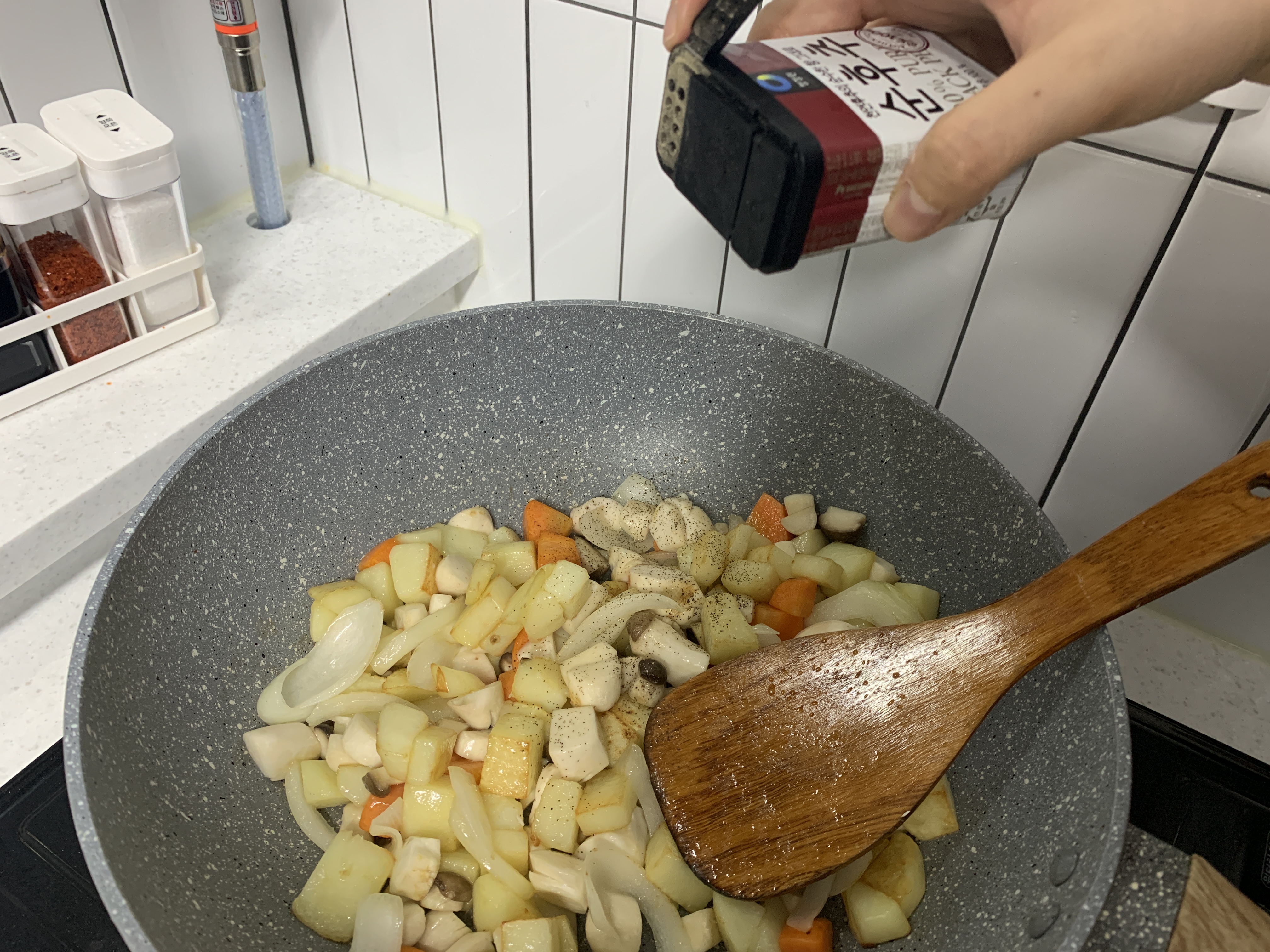 그럼 이제 거의 끄읕! 정말 초간단 카레요리! 예열된 후라이팬에 기름을 스윽 둘러줍니다. 그리고 감자가 젤 늦게 익을 것 같아 저는 감자>당근>양파>버섯 순으로 볶아줬습니다. 사실 감자 말고는 순서가 크게 의미가 없을 것 같아서.. 감자를 볶은 후에는 나머지 야채를 한꺼번에 볶았습니다!