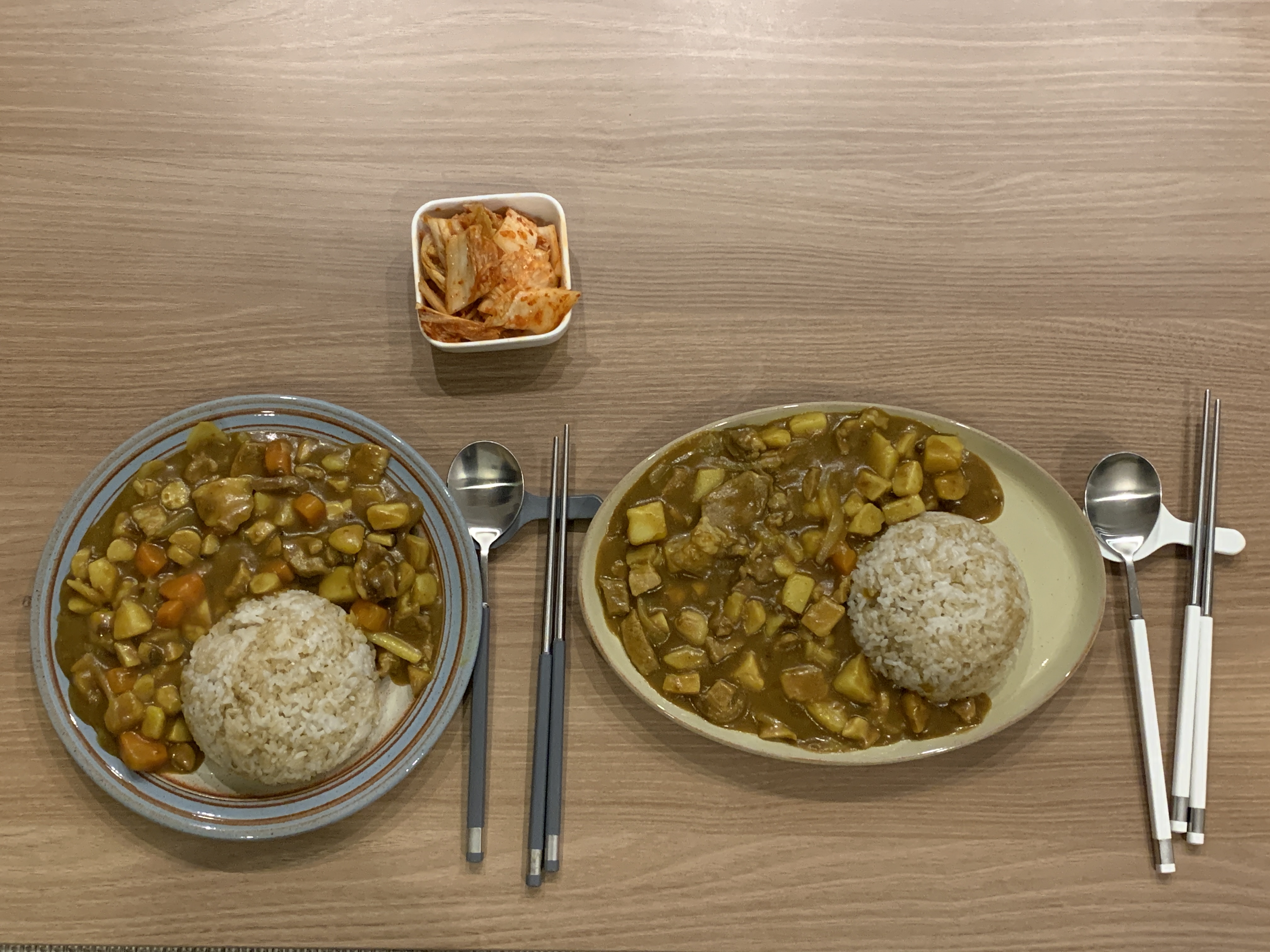 첫카레인데 남편이랑 서로 자화자찬하며 먹었습니다. 안에 들어가 있는 고기가 신의 한수였다는! 감자도 맛있게 익고 같이 먹은 김치도 최고였어요. 예전에 엄마가 해줬던 게 기억나기도 하구...